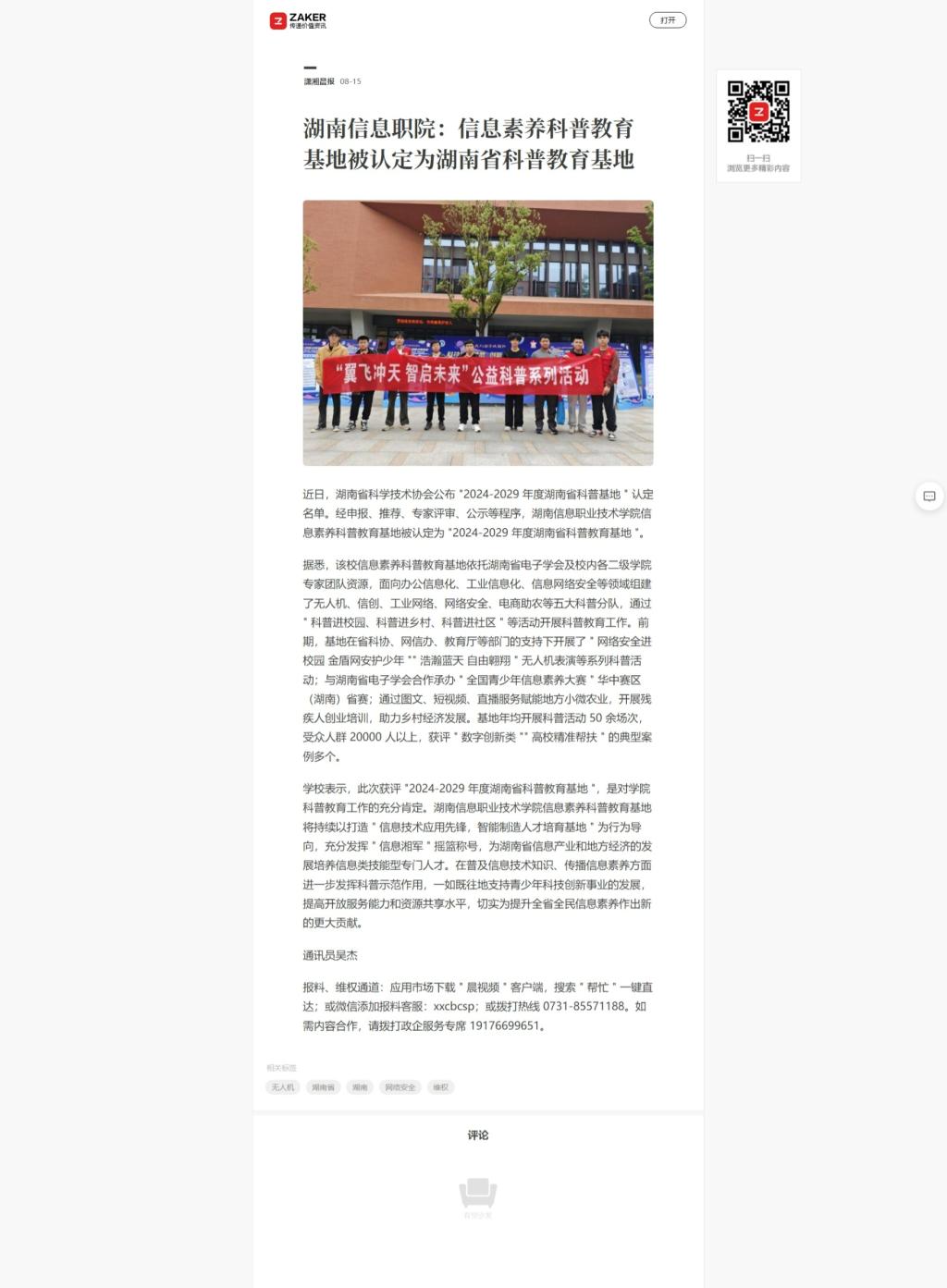 8月15日,ZAKER发布《湖南信息职院:信息素养科普教育基地被认定为湖南省科普教育基地》