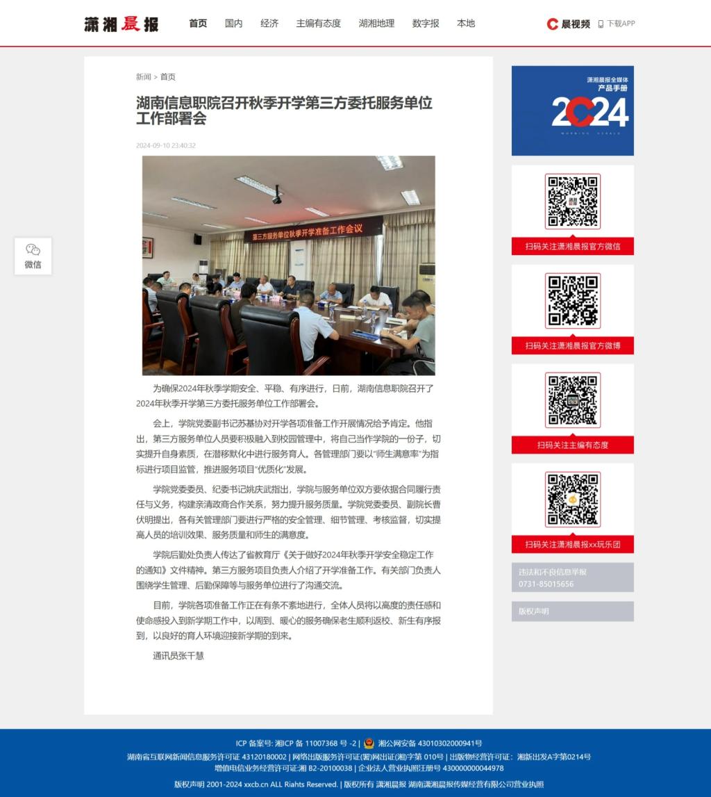 9月10日,潇湘晨报网发布《湖南信息职院召开秋季开学第三方委托服务单位工作部署会》