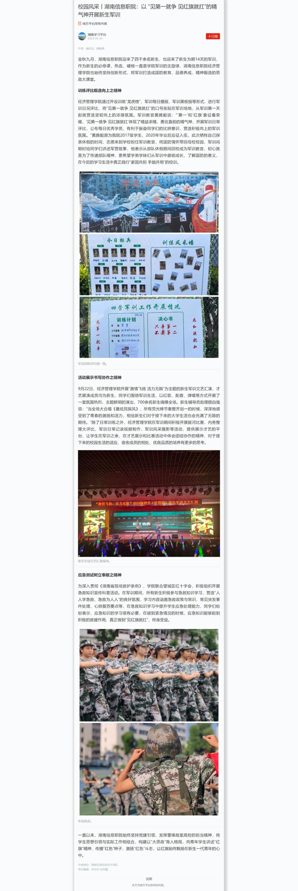 9月26日,学习强国发布《校园风采丨湖南信息职院:以 “见第一就争 见红旗就扛”的精气神开展新生军训》