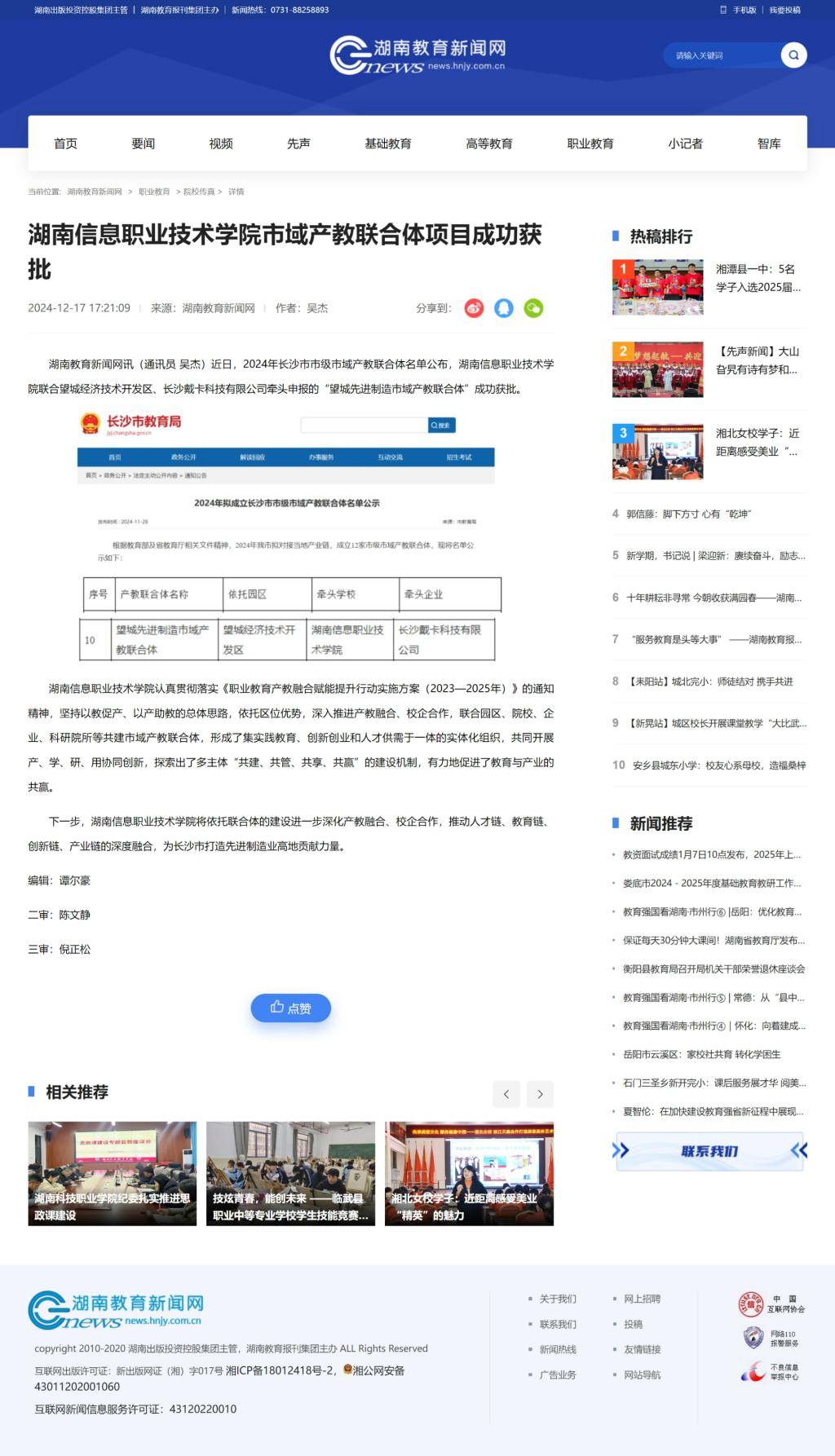 12月17日,湖南教育新闻网发布《beat365英国官方网站市域产教联合体项目成功获批》