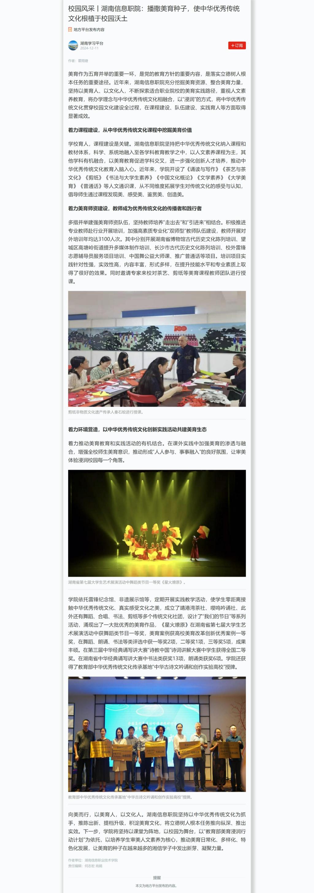 12月11日,学习强国发布《校园风采丨湖南信息职院:播撒美育种子,使中华优秀传统文化根植于校园沃土》