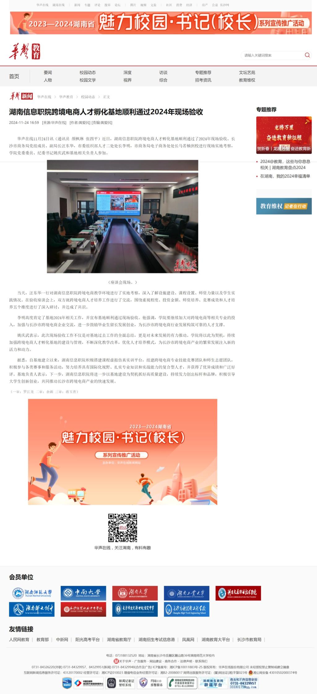 11月24日,华声在线发布《湖南信息职院跨境电商人才孵化基地顺利通过2024年现场验收》