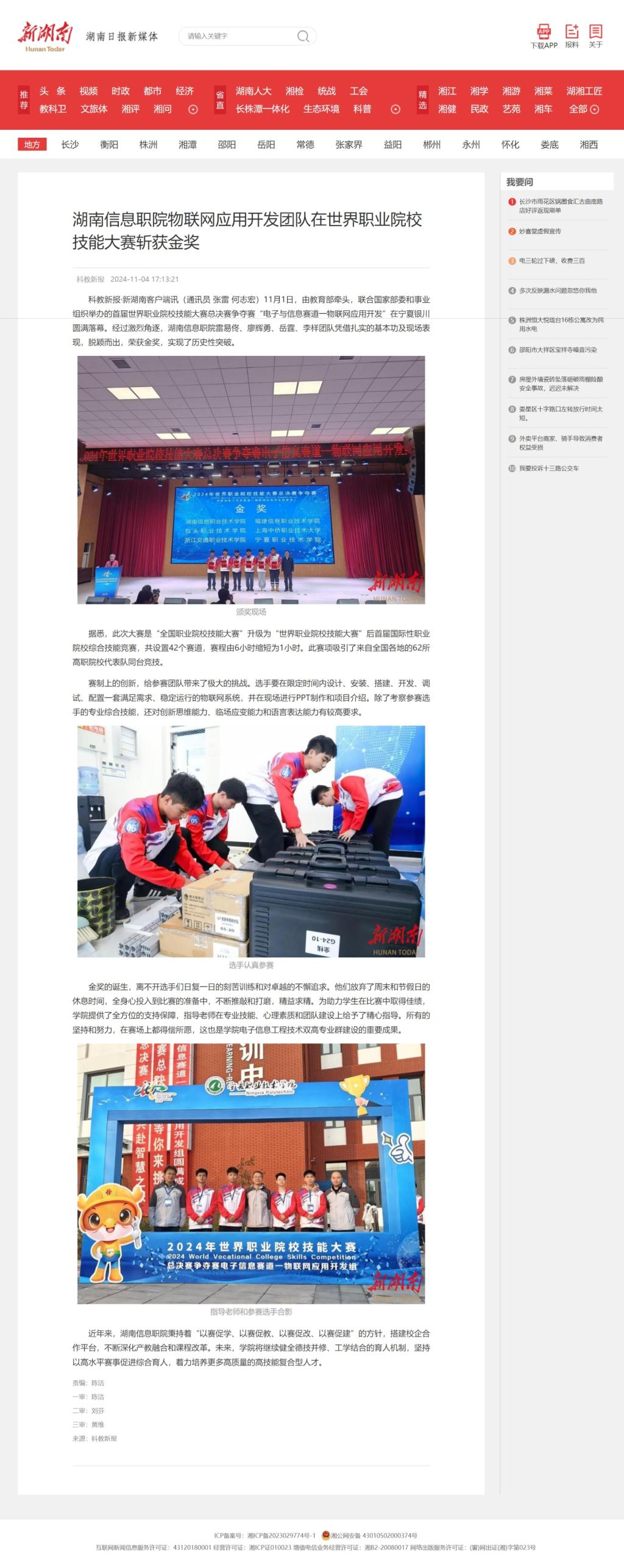 11月4日,新湖南发布《湖南信息职院物联网应用开发团队在世界职业院校技能大赛斩获金奖》