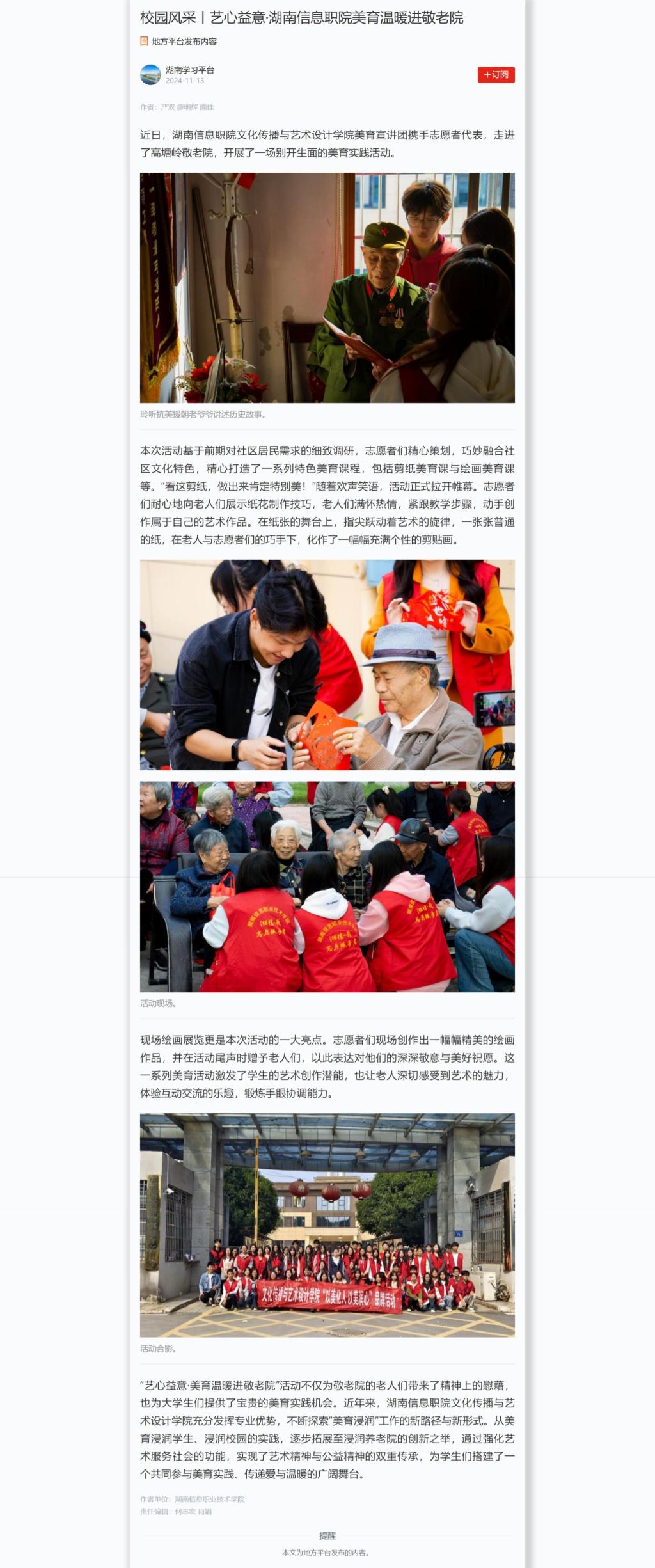 11月13日,学习强国发布《校园风采丨艺心益意·湖南信息职院美育温暖进敬老院》