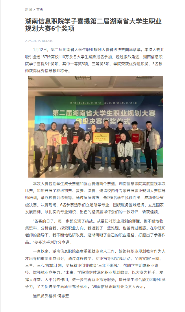 1月15日,潇湘晨报网发布《湖南信息职院学子喜提第二届湖南省大学生职业规划大赛6个奖项》。