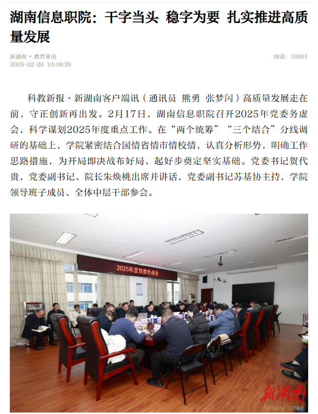 2月20日,新湖南发布《湖南信息职院:干字当头,稳字为要,扎实推进高质量发展》。