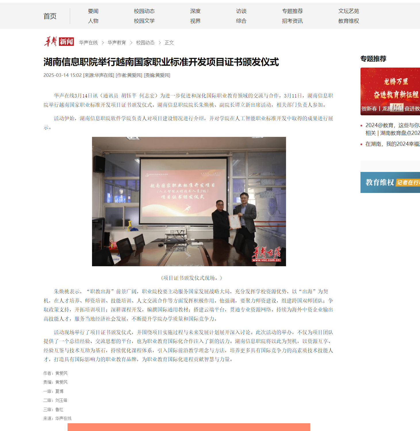 3月14日,华声在线发布《湖南信息职院举行越南国家职业标准开发项目证书颁发仪式》。