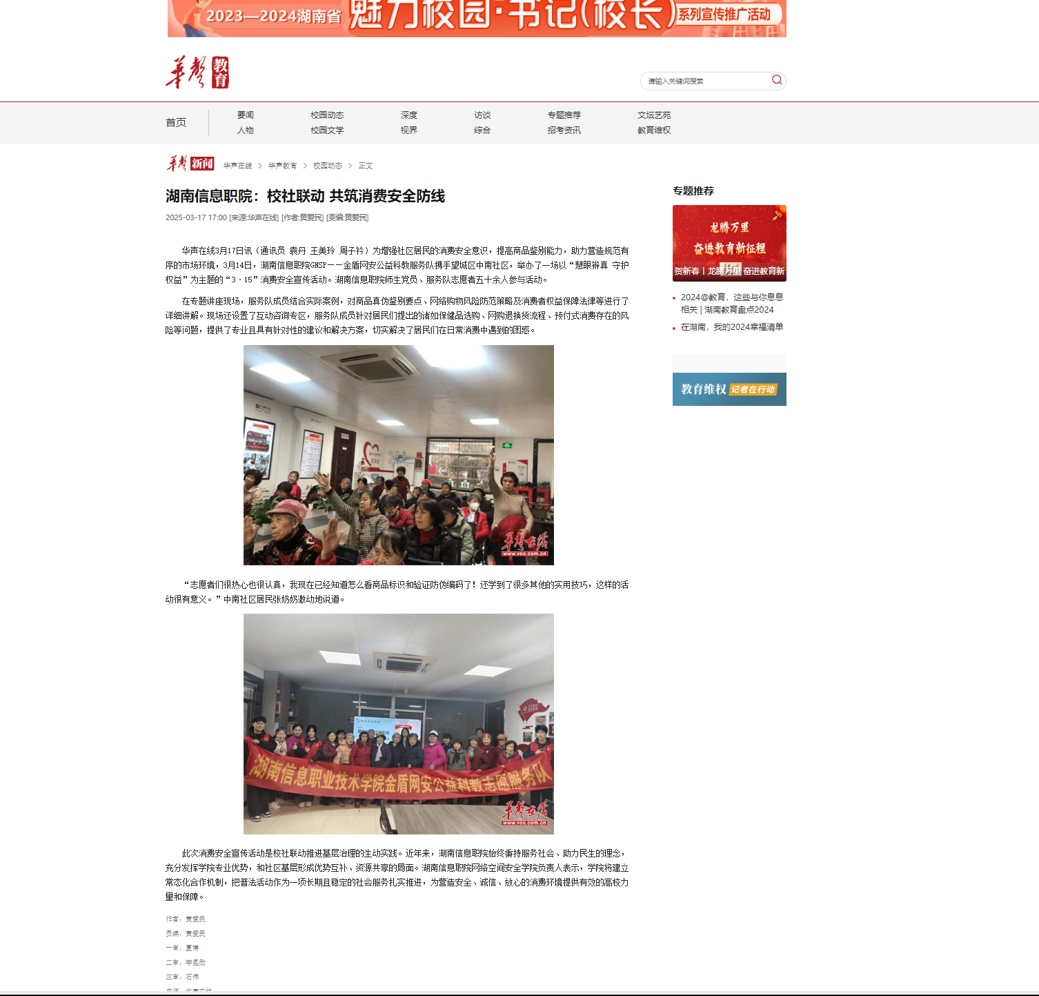 3月17日,华声在线发布《湖南信息职院:校社联动 共筑消费安全防线》。