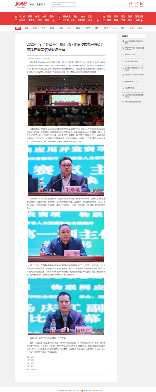 3月24日,湖南教育新闻网发布《2025年度“楚怡杯”湖南省职业院校技能竞赛2个赛项在湖南信息职院开幕》。