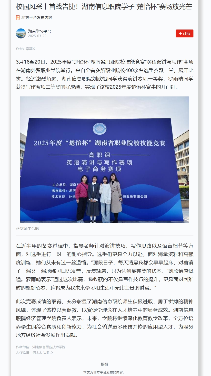 3月25日,学习强国发布《校园风采丨首战告捷!湖南信息职院学子“楚怡杯”赛场放光芒》。