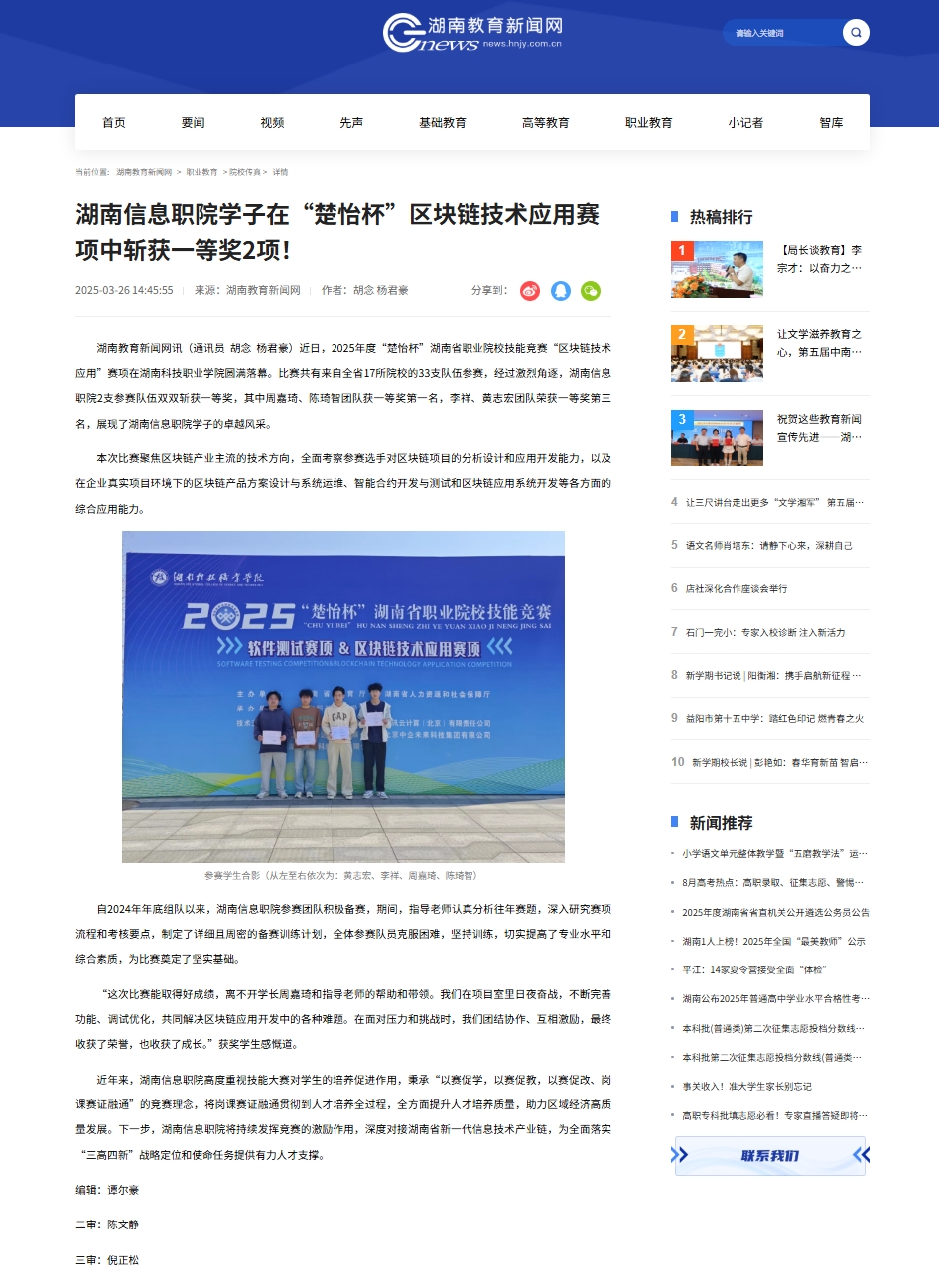 3月26日,湖南教育新闻网发布《湖南信息职院学子在“楚怡杯”区块链技术应用赛项中斩获一等奖2项》。