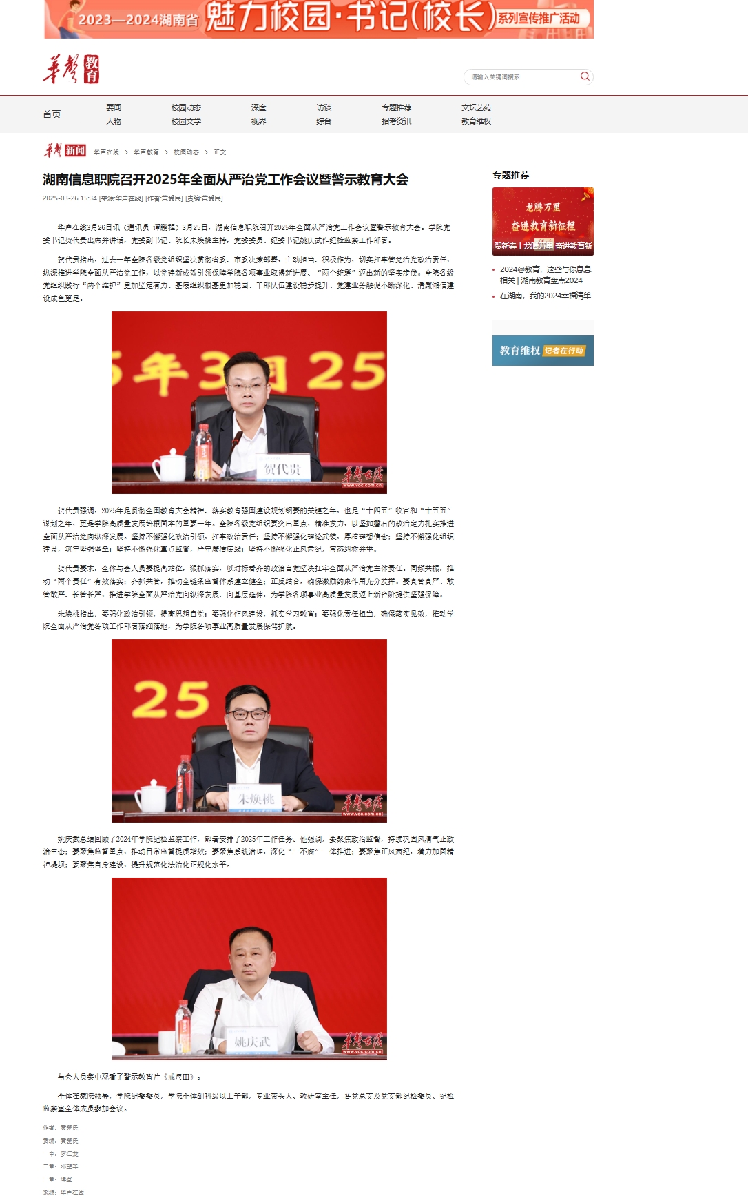 3月26日,华声在线发布《湖南信息职院召开2025年全面从严治党工作会议暨警示教育大会》。
