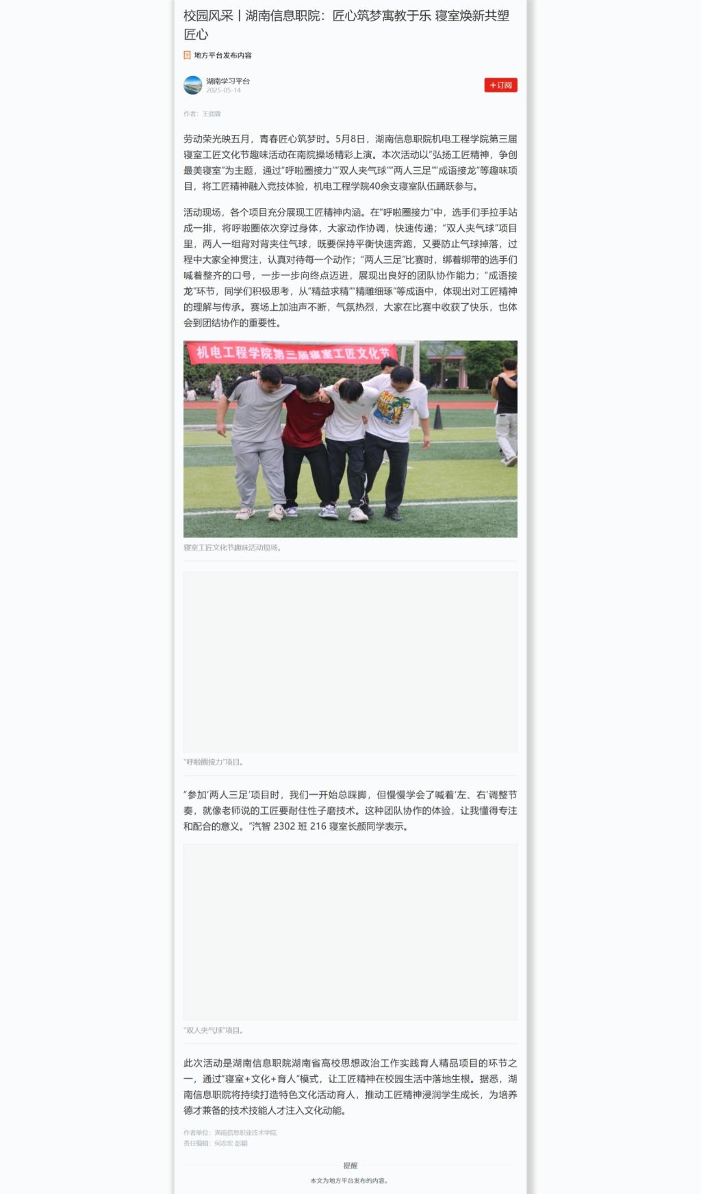 5月14日,学习强国发布《校园风采丨湖南信息职院:匠心筑梦寓教于乐 寝室焕新共塑匠心》。