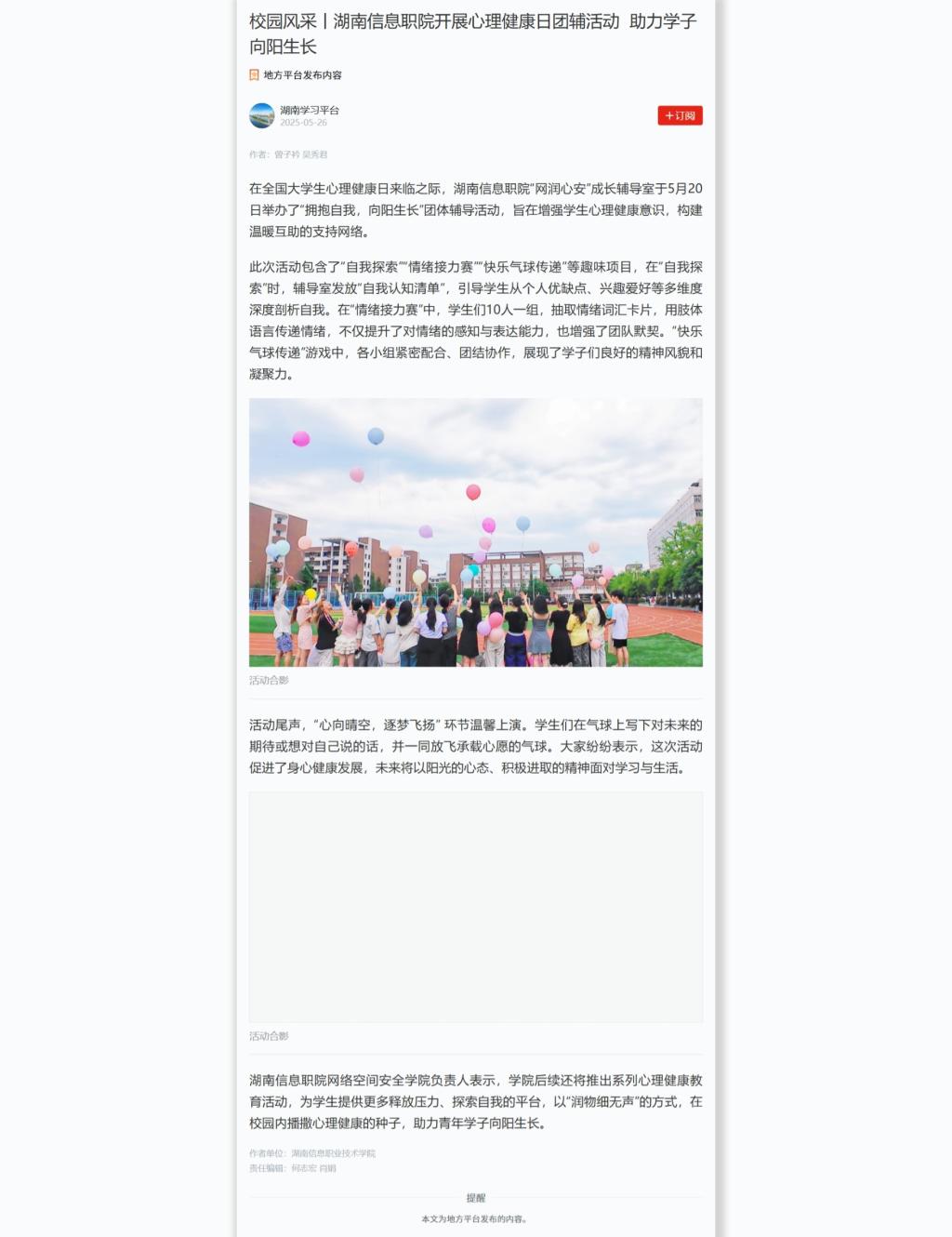5月26日,学习强国发布《校园风采丨湖南信息职院开展心理健康日团辅活动 助力学子向阳生长》