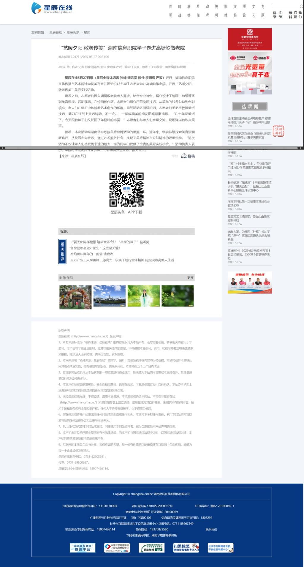 5月27日,星辰在线发布《“艺暖夕阳 敬老传美”湖南信息职院学子走进高塘岭敬老院》