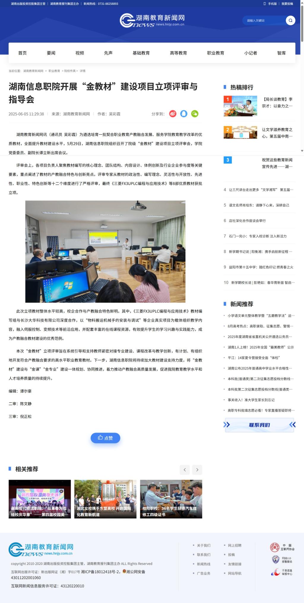 6月5日,湖南教育新闻网发布《湖南信息职院开展“金教材”建设项目立项评审与指导会》