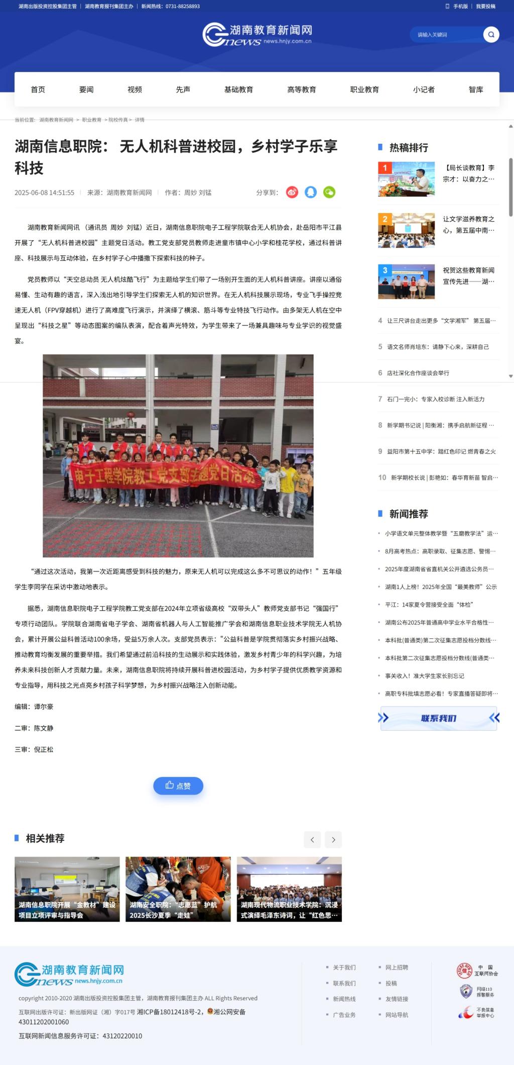 6月8日,湖南教育新闻网发布《湖南信息职院: 无人机科普进校园,乡村学子乐享科技》