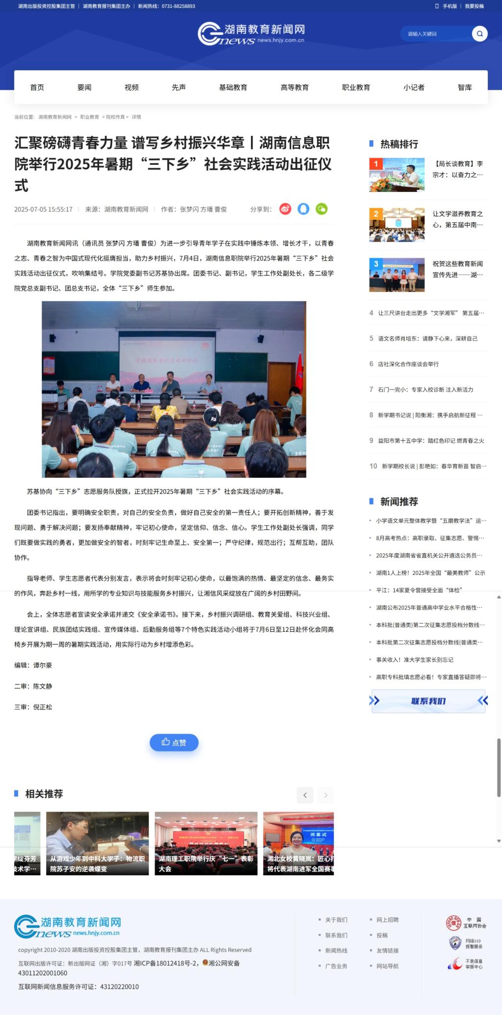 7月5日,湖南教育新闻网发布《汇聚磅礴青春力量 谱写乡村振兴华章丨湖南信息职院举行2025年暑期“三下乡”社会实践活动出征仪式》
