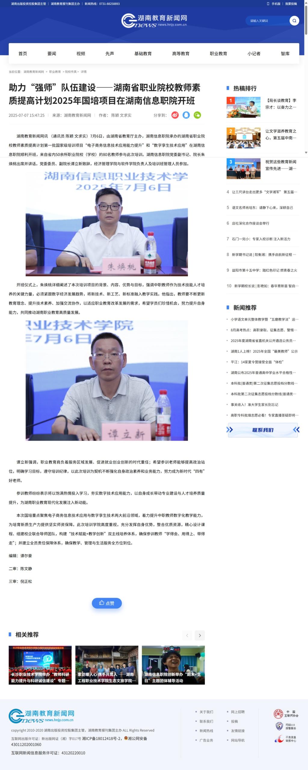 7月7日,湖南教育新闻网发布《助力“强师”队伍建设——湖南省职业院校教师素质提高计划2025年国培项目在湖南信息职院开班》