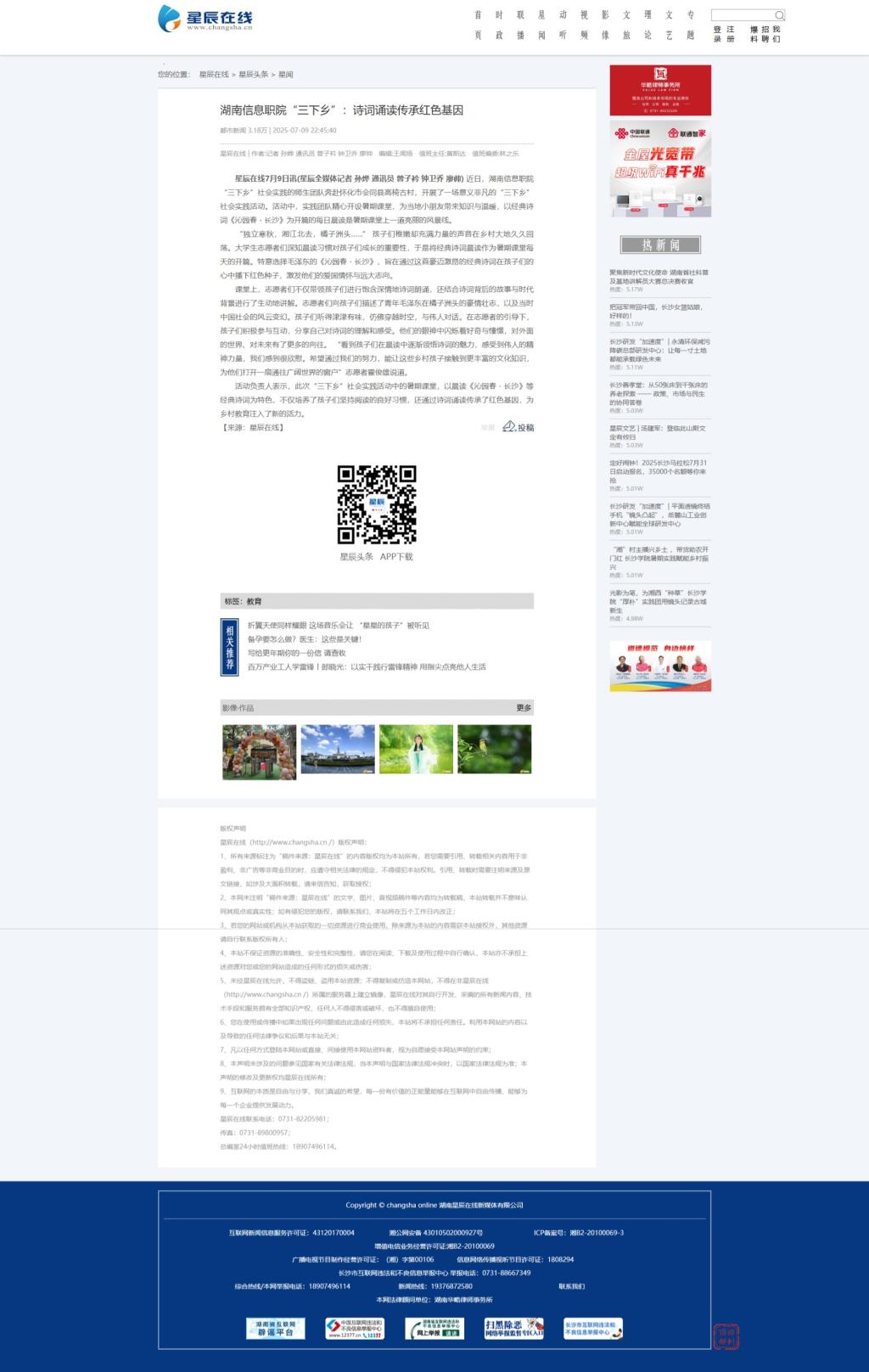 7月9日,星辰在线发布《湖南信息职院“三下乡”:诗词诵读传承红色基因》