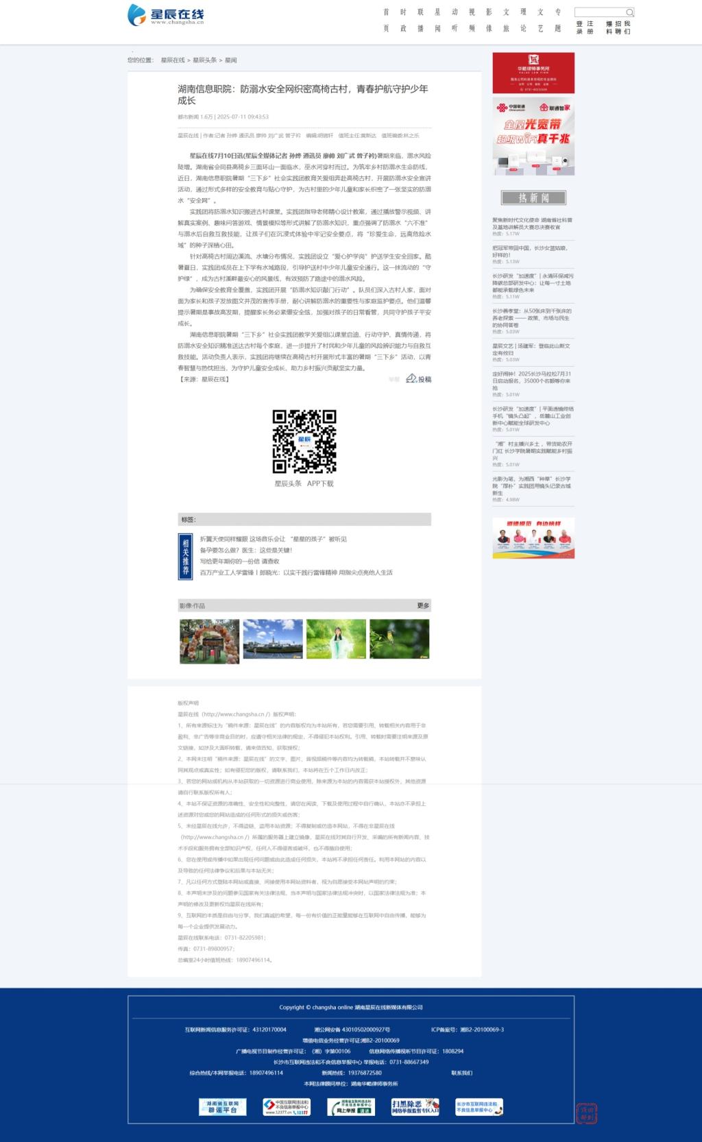 7月11日,星辰在线发布《湖南信息职院:防溺水安全网织密高椅古村,青春护航守护少年成长》