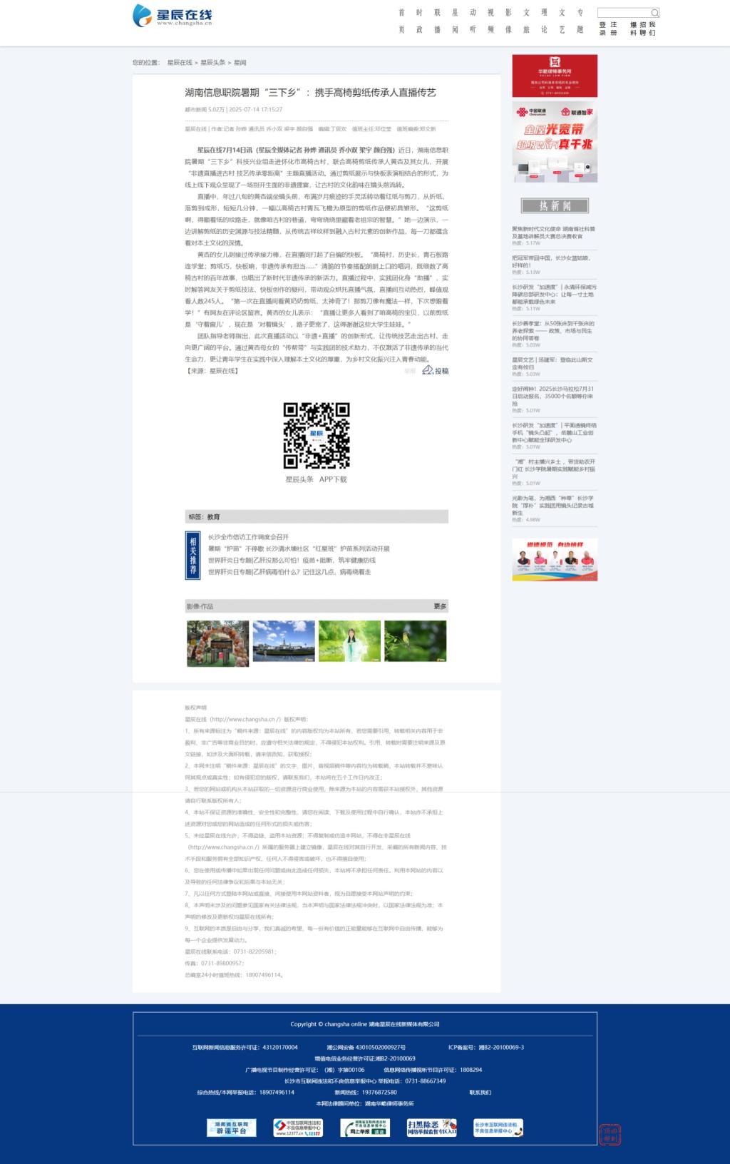 7月14日,星辰在线发布《湖南信息职院暑期“三下乡”:携手高椅剪纸传承人直播传艺》