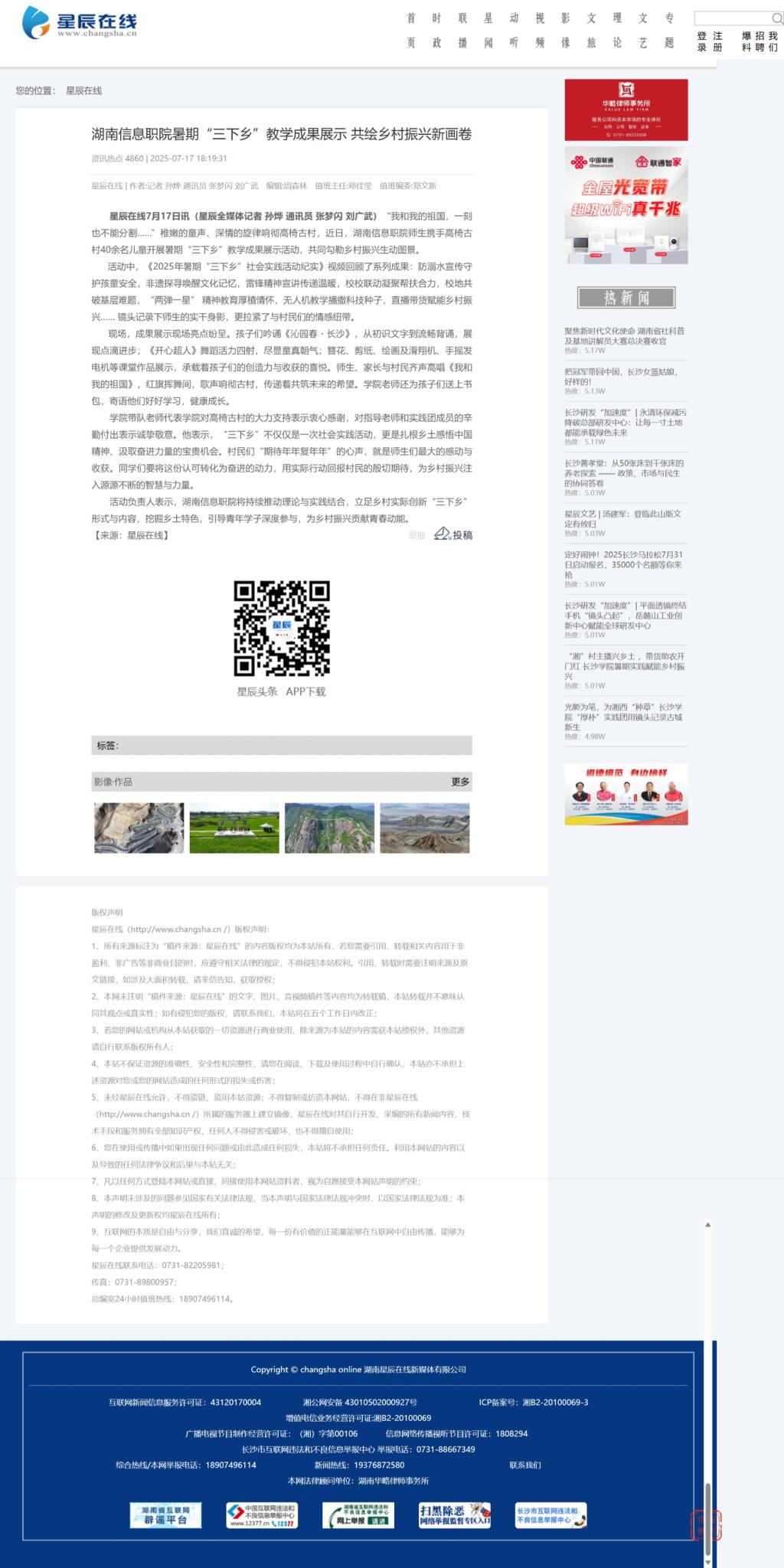 7月17日,星辰在线发布《湖南信息职院暑期“三下乡”教学成果展示 共绘乡村振兴新画卷》