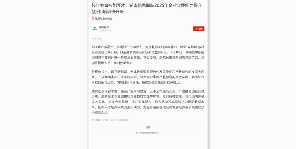 7月16日,学习强国发布《校企共育技能匠才:湖南信息职院2025年企业实践能力提升(苏州)培训班开班》