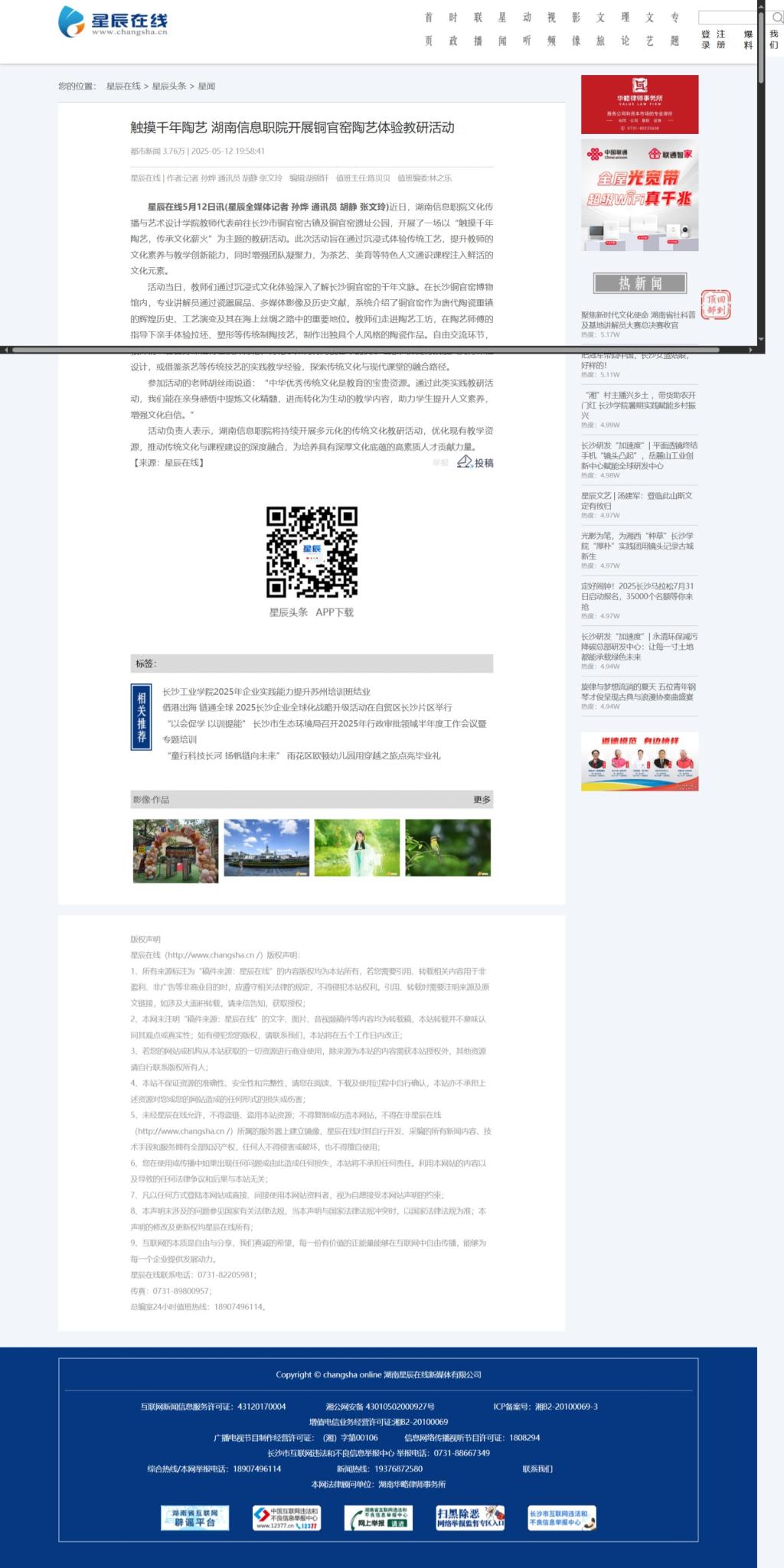 5月12日,星辰在线发布《触摸千年陶艺 湖南信息职院开展铜官窑陶艺体验教研活动》