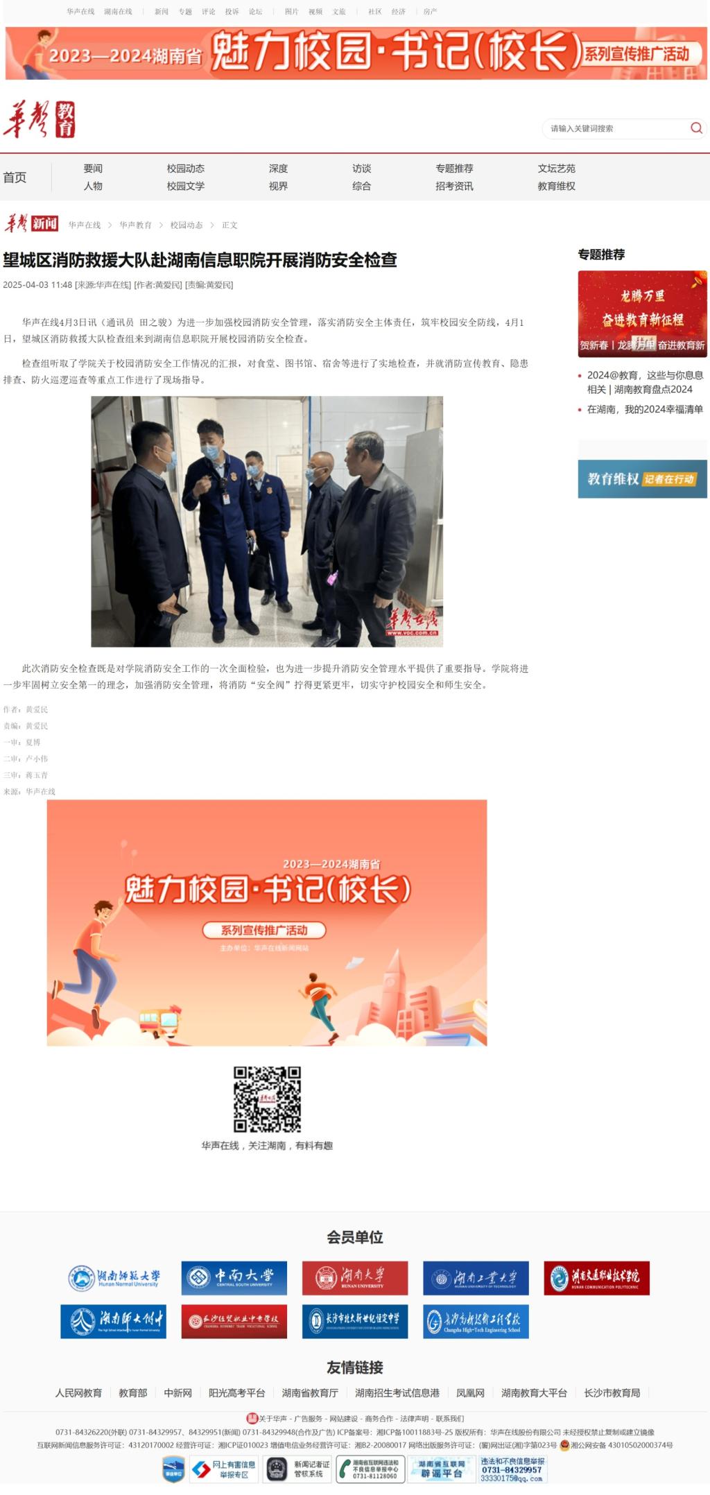 4月3日,华声在线发布《望城区消防救援大队赴湖南信息职院开展消防安全检查》