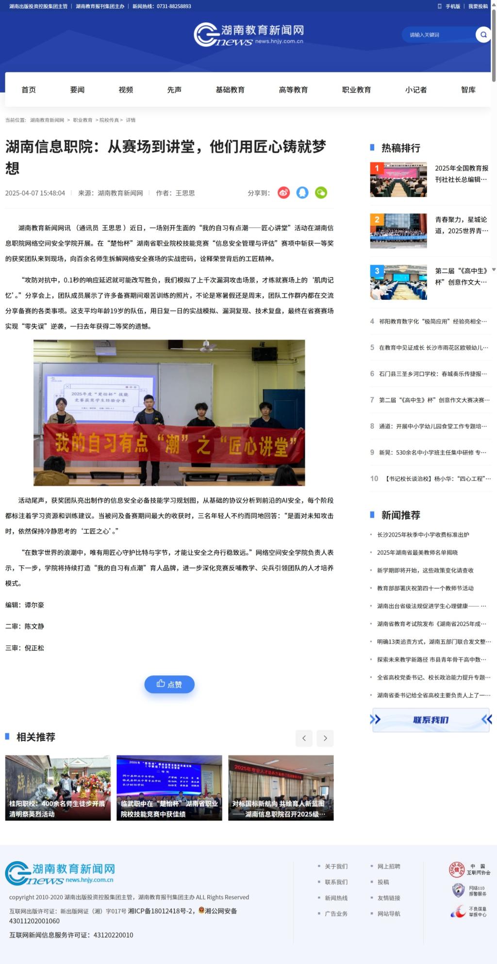 4月7日,湖南教育新闻网发布《湖南信息职院:从赛场到讲堂,他们用匠心铸就梦想》