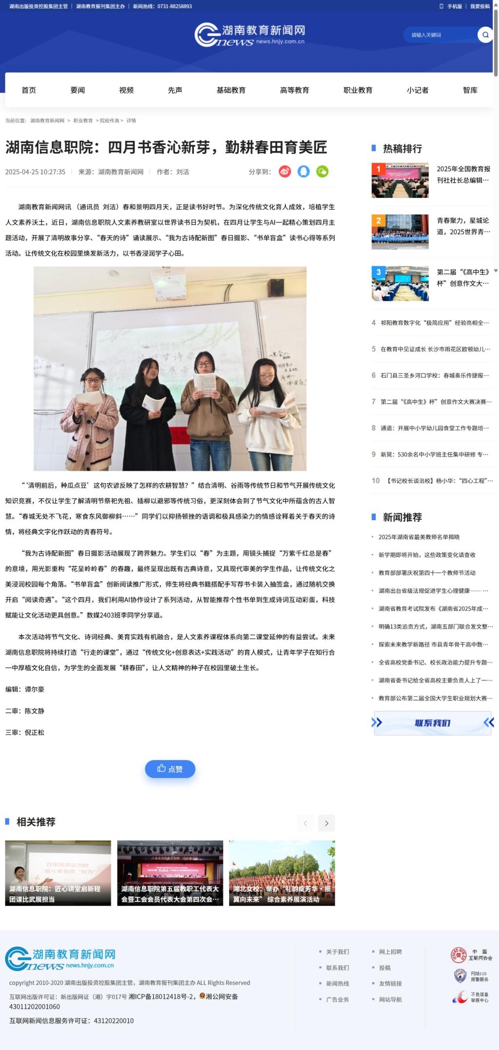 4月25日,湖南教育新闻网发布《湖南信息职院:四月书香沁新芽,勤耕春田育美匠》