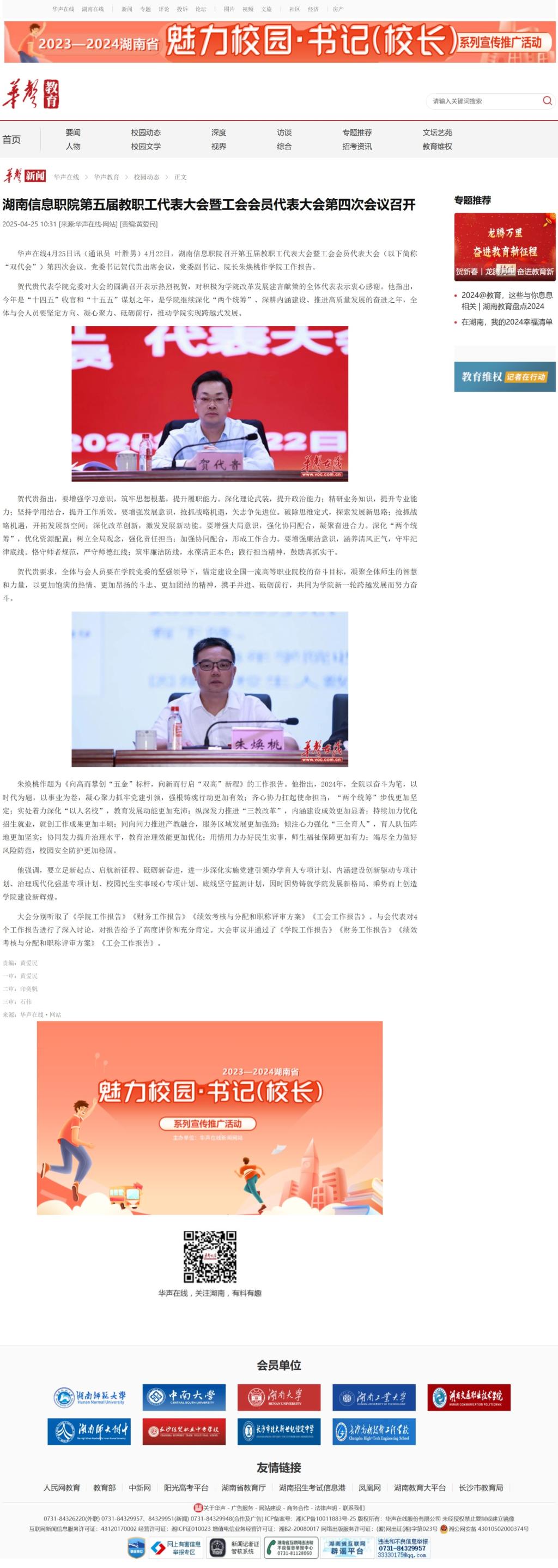 4月25日,华声在线发布《湖南信息职院第五届教职工代表大会暨工会会员代表大会第四次会议召开》