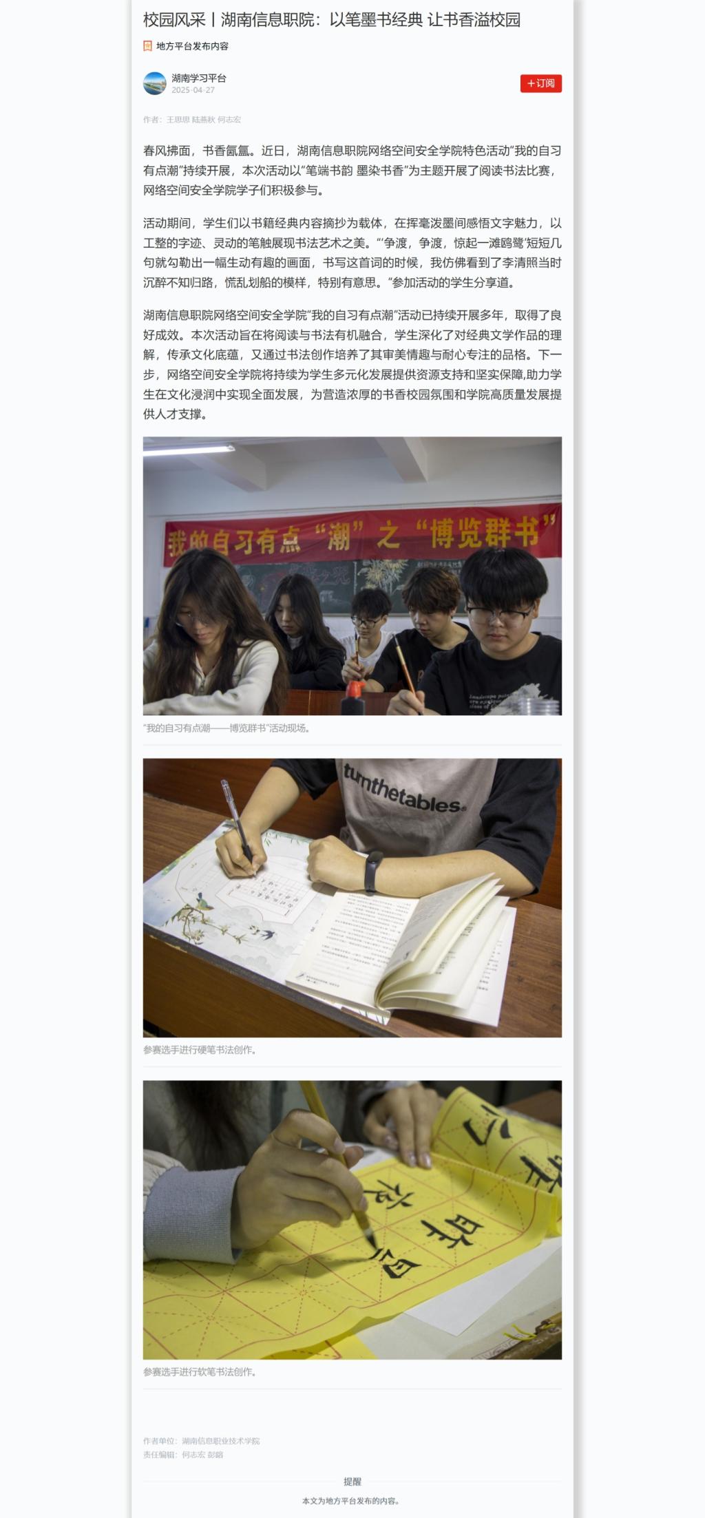 4月27日,学习强国发布《校园风采丨湖南信息职院:以笔墨书经典 让书香溢校园》