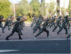 “弓步冲拳,穿喉弹踢,马步横打,内拨下勾,交错侧踹……”跟随着教官的示范和讲解,学生有模有样的跟着学习,也许他们的动作不很规范,他们的拳头还很稚嫩,但他们口号嘹亮,一个个英姿飒爽,展示出了机电学子的热血与青春。