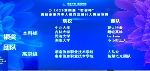 9月14日,2023第四届“芯创杯”高校未来汽车人机交互设计大赛在长沙的湖南大学圆满落幕,beat365英国官方网站汽车智能技术专业的“人从众”团队经过激烈角逐,荣居高职组第二名,斩获大赛银奖。