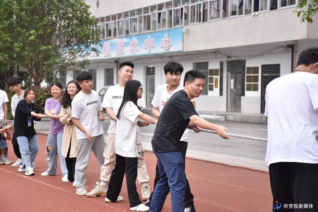 辅导员们也被现场气氛感染,带领学生们自行组织了一场趣味赛。双方势均力敌,脸都涨得面红耳赤,使尽浑身力气,围观群众叫好声不断。