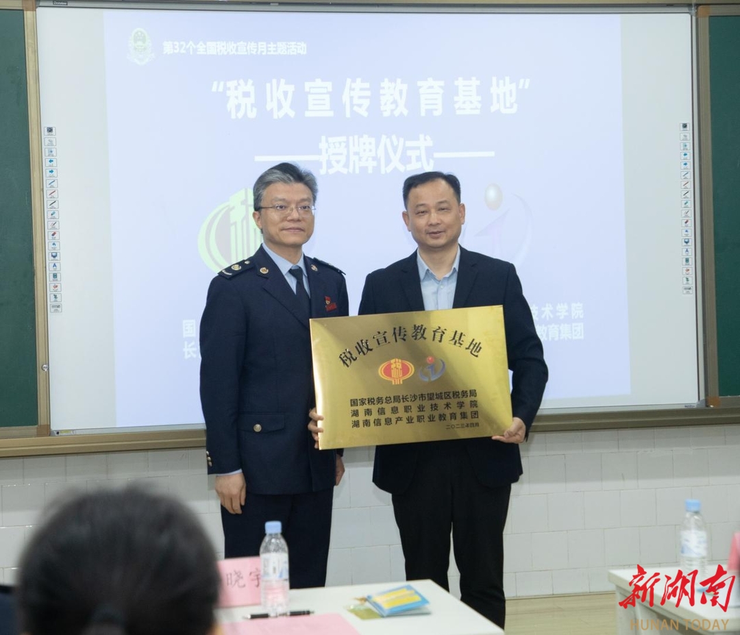 ▲望城区税务局局长井晓宇为湖南信息职院税收宣传教育基地授牌