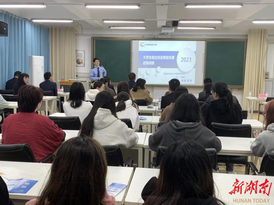 ▲望城区税务局税法专家肖黎明为学生讲解大学生创业就业税收优惠政策