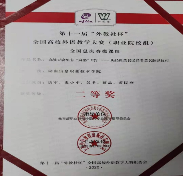 湖南省职业院校英语口语技能竞赛二等奖