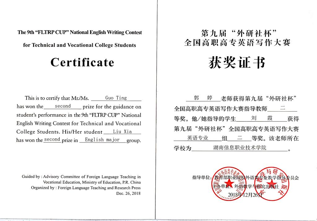 全国高职高专英语写作比赛二等奖