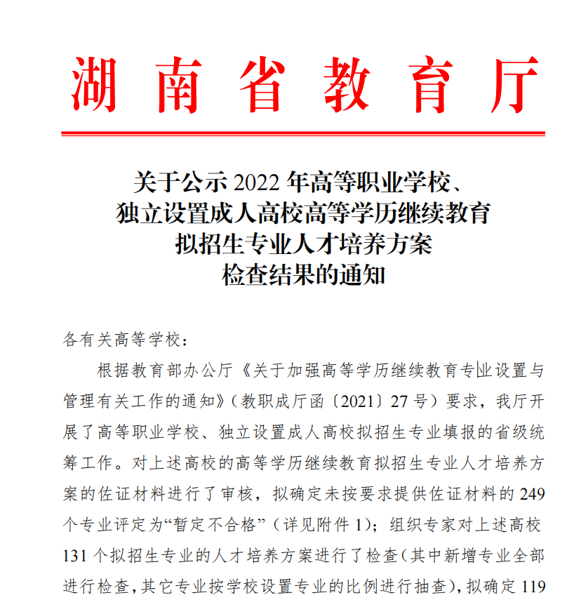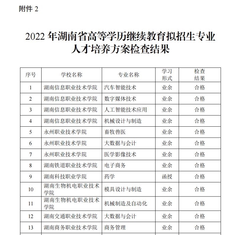 3月23日,省教育厅发布《关于公示2022年高等职业学校、独立设置成人高校高等学历继续教育拟招生专业人才培养方案检查结果的通知》,beat365新增的汽车智能技术、数字媒体技术、人工智能技术应用三个专科业余专业和抽检的机械设计与制造人才培养方案全部合格。