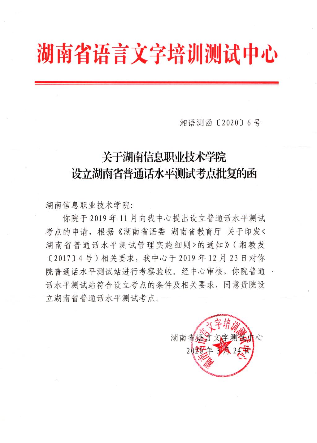 经湖南省语言文字培训测试中心批准,同意在beat365设立普通话水平测试考点《关于beat365英国官方网站设立湖南省普通话水平测试考点批复的函(湘语测函〔2020〕6号)》。以后,beat365可开展面向全体在籍学生的普通话水平测试。
