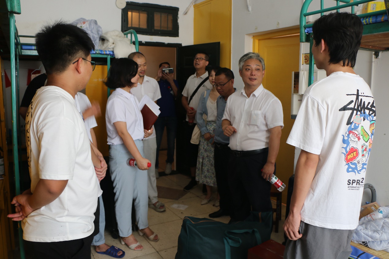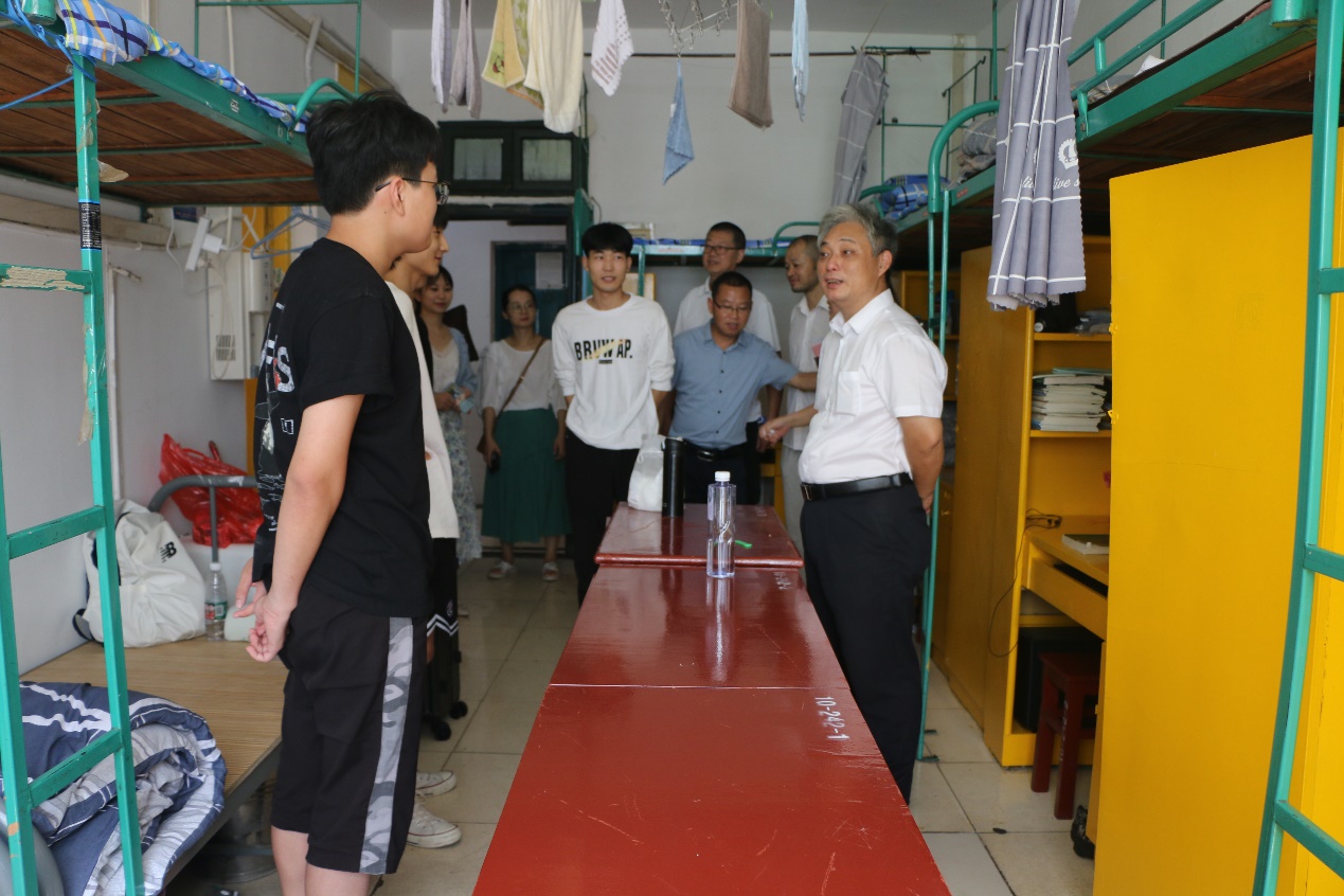 在北院十号楼学生寝室,余求根亲切地同新生交谈,询问大家来自哪里、入学报到是否顺利、并耐心地解答新生提出的问题。还特别看望了来自外省的新生,他亲切地询问了内蒙古和广州的新生,饮食是否习惯,是否适应学校环境,也希望他们能够和室友能够友好相处。