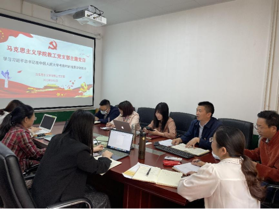 主题党日活动开始,大家首先集体认真观看学习了新闻报道,对习近平总书记的重要讲话精神进行了回顾和学习。学习之后,大家进行了座谈交流,纷纷畅谈自己的看法。马克思主义学院院长谭必翰在发言中说到,习近平总书记的重要讲话是对我们工作的最好指导,作为新时代的一个党员和思政教师,要高度重视理论和文件的学习,在学习中提升教学本领,要让学生信,首先要自己先信。作为去年参加了全国《形势与政策》展示比赛并获得特等奖的青年教师金艳,特别有感受,学习了习近平总书记考察人民大学时的讲话,深感鼓舞和深受启发。在考察中习近平总书记对思政课教师提出了新的要求,作为一名高校思政课教师,我感觉上好思政课是十分不容易的。习近平总书记说思政课的本质是讲道理,如何讲好这个道理呢?我认为思政教师除了努力加强政治理论学习,不断理论水平之外,同时也要努力探索和钻研,交流与研讨,为上好思政课打好基础,真正发挥立德树人作用,切实做到把思政课讲活,讲深,讲透,打造真正的思政金课。阳建鹏老师在发言中认为习近平总书记在中国人民大学观摩思政课智慧教室现场教学并发表重要讲话,充分体现了党中央对思政课教师的殷切期待。作为一名高校思政课教师,我深受鼓舞。思政课的本质是讲道理,要注重方式方法,把道理讲深、讲透、讲活。这为我们马克思主义学院教师上好思政课指明了方向。思政课教师要牢记习近平总书记的谆谆教导,充分发挥思想政治理论课在立德树人中的重要作用。积极探索教学方法,聚焦到如何把道理讲深、讲透、讲活,讲出情感,引起学生共鸣,当学生知识的解惑人,做学生价值的塑造者,为党和国家培养德才兼备、全面发展的人才。龙可老师发言中说到,习近平总书记在中国人民大学考察时强调,广大青年要做社会主义核心价值观的坚定信仰者、积极传播者、模范践行者,向英雄学习、向前辈学习、向榜样学习,争做堪当民族复兴重任的时代新人,在实现中华民族伟大复兴的时代洪流中踔厉奋发、勇毅前进。这个让我联想到我们心理课程设计中有个环节叫榜样引学,是提前布置给学生小组任务,让他们提前搜集整理提炼与主题内容相关的榜样素材,在课堂上的榜样引学环节讲榜样故事,其他学生学榜样精神。在这样的活动中也是课堂内容的一种积淀和升华。我们教师自己也要做学生的榜样,从思想,学习,生活,做人做事等方面都积极提升自己,做自己的榜样,也做学生的榜样。佘鸿耀老师在发言中认为,学习了习近平总书记在人大考察时的讲话,我倍受鼓舞。作为一名思政课教师,要遵循习近平总书记的教诲,坚守立德树人根本任务,进一步提升思政课亲和力和吸引力。要扎根湖南大地,充分挖掘红色资源,传承红色基因,打造出更多深受学生喜爱的思政“金课”。我们既要学做“经师”,更要学做“人师”,以实际行动推动思政课创新发展。王春红老师发言认为学习习近平总书记考察中国人民大学的重要讲话精神,倍感鼓舞,深受启发。教师是立教之本,兴教之源。我们作为思政课教师要始终守好立德树人初心,牢记为党育人、为国育才使命,始终坚持中国特色社会主义教育方向。不仅要做学生知识的引路人,更要做学生锤炼品格的引路人。努力打造思政“金课”,充分利用湖湘红色资源,讲好湖湘红色故事,开展“走近湖湘革命先辈”实践活动,让学生走近湖湘革命先辈,继承优良传统,赓续红色血脉,踔厉奋发,勇毅前进!随后其他老师积极发言,大家纷纷表示,要牢记总书记的殷切嘱托,发挥好思政课立德树人的关键课程作用,为培养造就听党话、跟党走,堪当民族复兴重任的时代新人做出贡献。同时,要进一步把重要讲话精神有效转化为实际行动和扎扎实实的工作效果,努力把湖南信息职院建设成为特色鲜明的地方性应用型高水平本科院校而不懈努力。