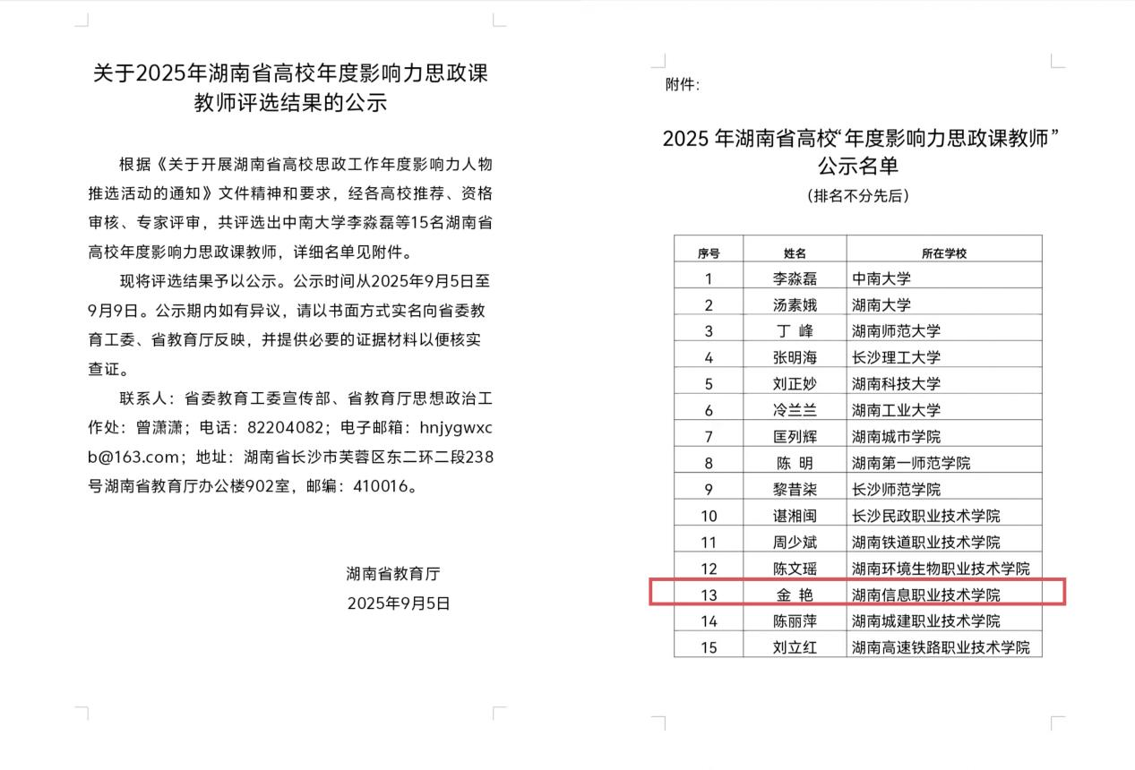 9月9日上午,湖南省庆祝第41个教师节大会在长沙隆重举行。beat365马克思主义学院金艳老师作为湖南省高校优秀思政工作者代表受到表彰,与所有获奖人员与省领导亲切会见并合影留念。荣誉双至,教师节前夕,喜讯传来,金艳获评2025年湖南省高校年度影响力思政课教师荣誉称号,给自己的教师节再次送上一份大礼。