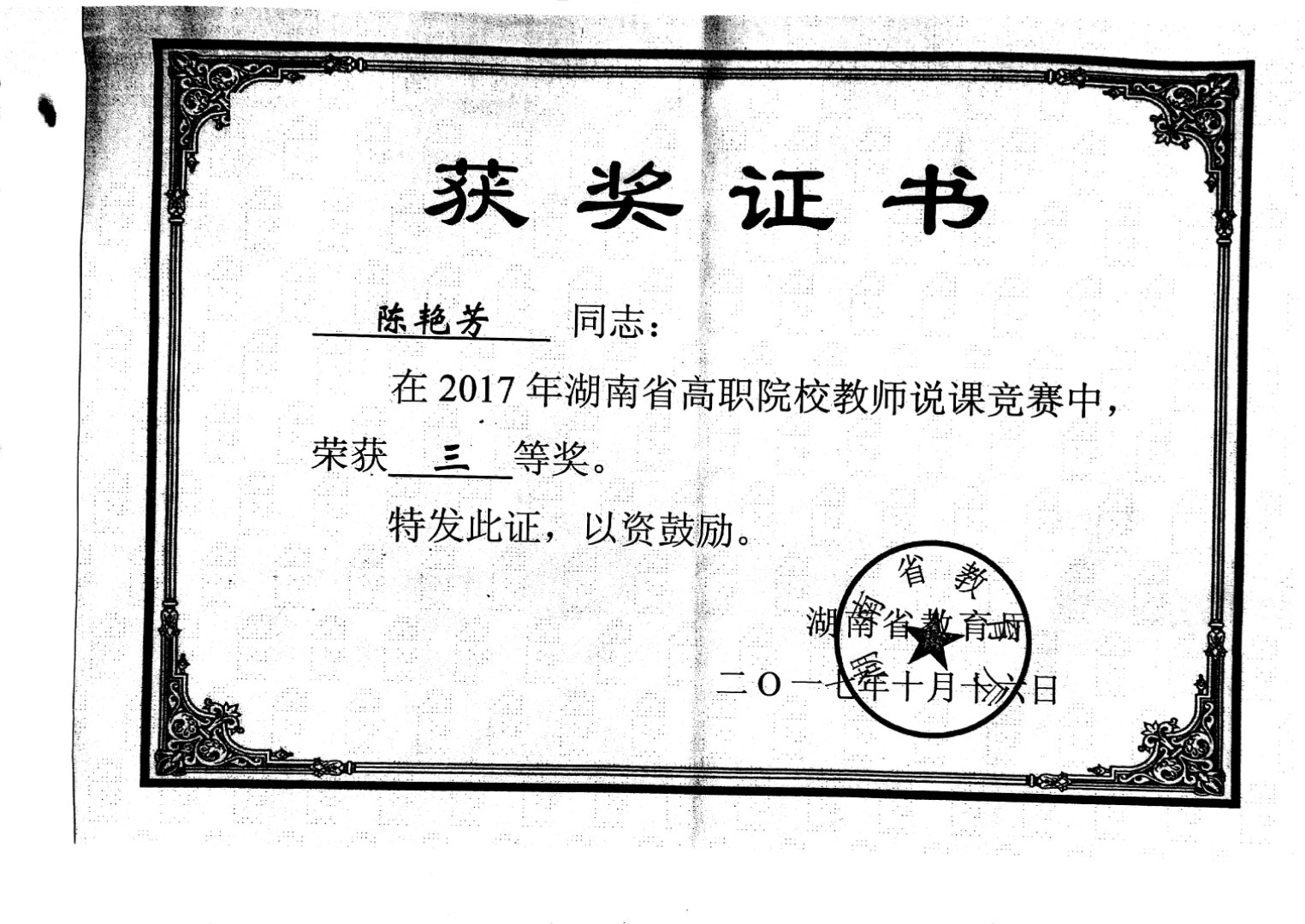 祝贺陈艳芳老师荣获湖南省高职院校教师说课比赛三等奖