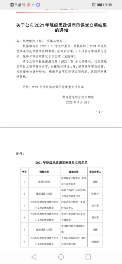 近日从学校发文传来喜讯,根据湘信院发〔2022〕15号文件通知,经专家评审,马克思主义学院金艳等老师申报的六个项目评审通过立项为2021年院级思政课示范课堂项目。这是马克思主义学院专注教学,思政育人,提升质量的又一成果。