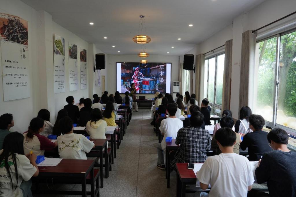 在飘峰山庄非遗工坊,研学重点蓝染传承人在现场演示了古法扎染“九浸九晒”工艺,学生们运用专业所学展开创作实践,活动现场诞生的50余幅扎染作品,既有传统“青花瓷”纹样的现代演绎,也不乏“新生生命”主题的创新表达。