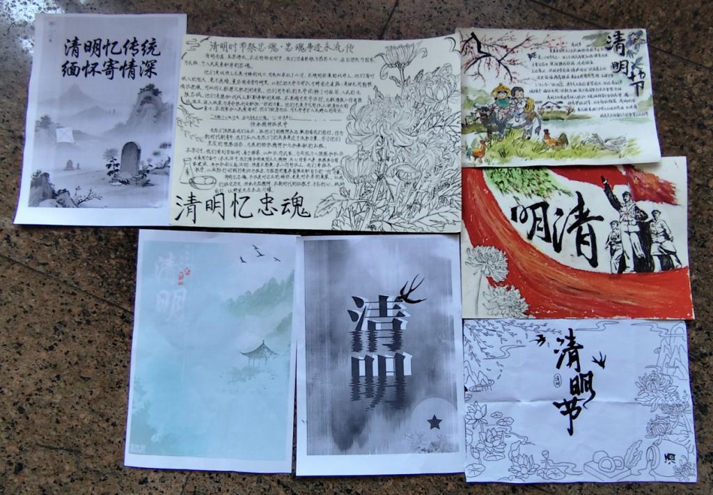 活动现场,同学们运用专业特长,使用绘图软件将青山翠柏、绿柳纸鸢等清明元素融入设计,通过冷色调背景与烈士浮雕的组合,传递庄严肃穆的缅怀之情;此外,还有学子手持彩铅,精心设计手绘版面,以工笔细描牧童遥指杏花村的诗意场景,用简笔勾勒祭扫烈士墓的庄严画面,工整的笔迹和生动的插画相得益彰。